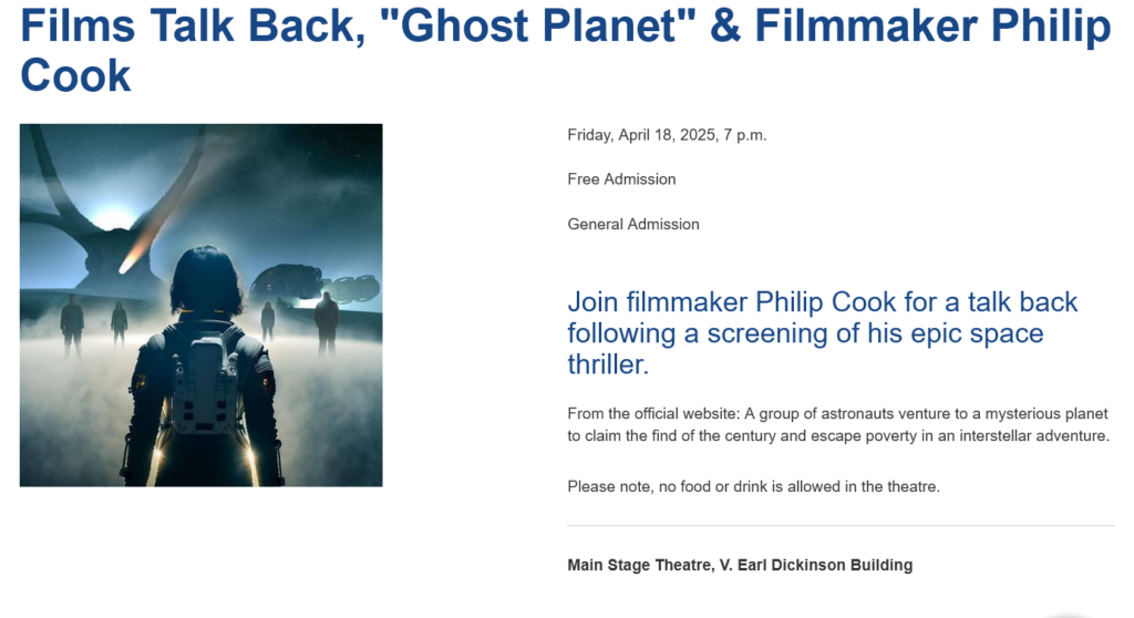 Ghost Planet screening in the beautiful Main Stage Theatre, V. Earl Dickinson Building at PVCC.